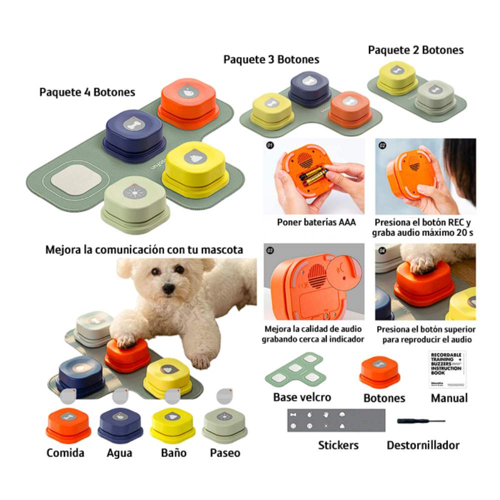 💡 Beneficio: Fortalece el vínculo al permitir que tu mascota exprese sus necesidades (comida, paseo, etc.).