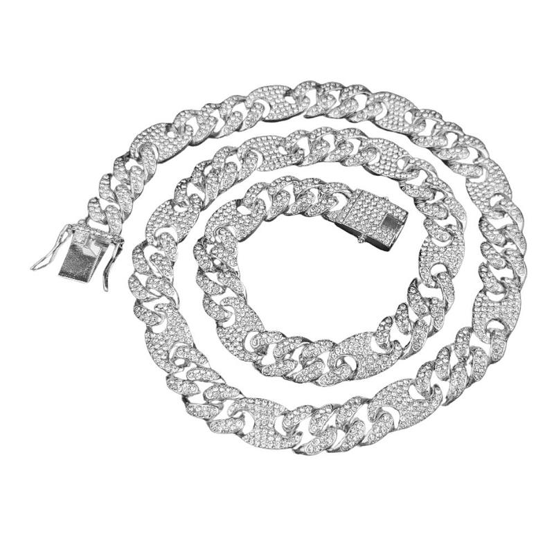 Cadena redonda de eslabones con acabado plateado con pedrería. Disponibles en talla S:20cm, M:40cm, L:60cm y XS:15cm