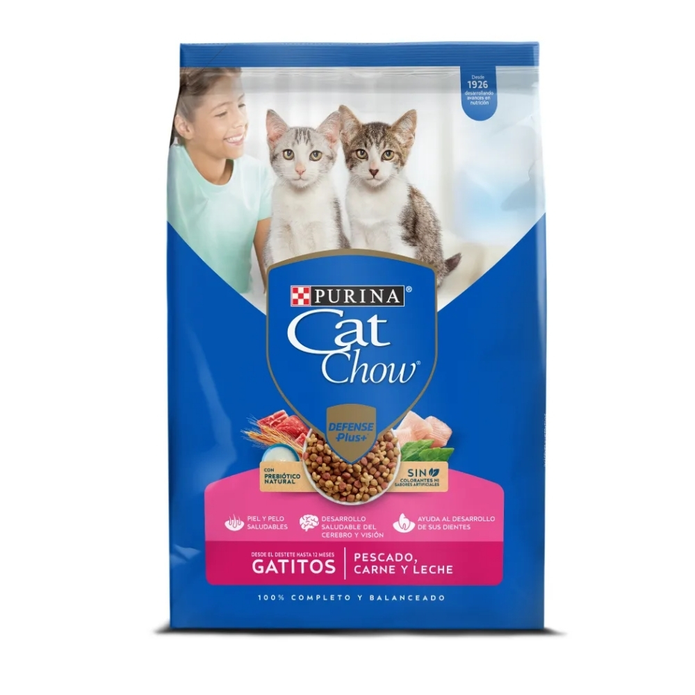 Harinas proteicas de origen animal (pollo, pescado, res y/o cerdo), maíz y/o arroz y/o sorgo, concentrado proteico (de soya y/o de maíz), harina de alga (Schizochytrium ssp.) y/o harina de pescado como fuente de ácidos grasos omega 3 (DHA), trigo, grasa (vacuna y/o porcina y/o avícola y/o de pescado y/o vegetal) como fuente de ácidos grasos omega 6, pirofosfato tetra sódico (TSPP), hidrolizado a base de hígados de pollo y/o de cerdo, leche en polvo, espinaca deshidratada, sal, cloruro de potasio, ácido fosfórico y/o bisulfato de sodio, carbonato de calcio y/o fosfato bicálcico, vitaminas [A, B1, B2, B3, B5, B6, B7, B9, B12, C, D3, E, K3], cloruro de colina, inulina (prebiótico), aminoácidos (lisina, metionina, taurina), minerales [sulfatos: (manganeso, hierro, cobre, zinc),proteinatosy/o glicinatos: (manganeso, hierro, cobre, zinc, selenio), yodato de calcio o potasio, selenito de sodio], colorantes naturales.