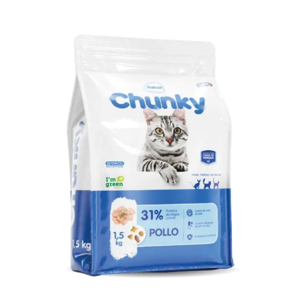 Alimento completo y balanceado diseñado para satisfacer las necesidades nutricionales de los felinos adultos. Su fórmula con pollo de alta calidad, elaborada con ingredientes seleccionados, proporciona la energía y los nutrientes esenciales para una vida activa y plena. Información Nutricional del Concentrado para Gatos Chunky Proteína(min) ⇨ 31.0% Grasa(min) ⇨ 10.0% Fibra cruda(max) ⇨ 4.0% Humedad(Max) ⇨ 12.0% Calcio(min) ⇨ 1.0% Fósforo(Min) ⇨ 0.80% Taurina(min) ⇨ 0.10%